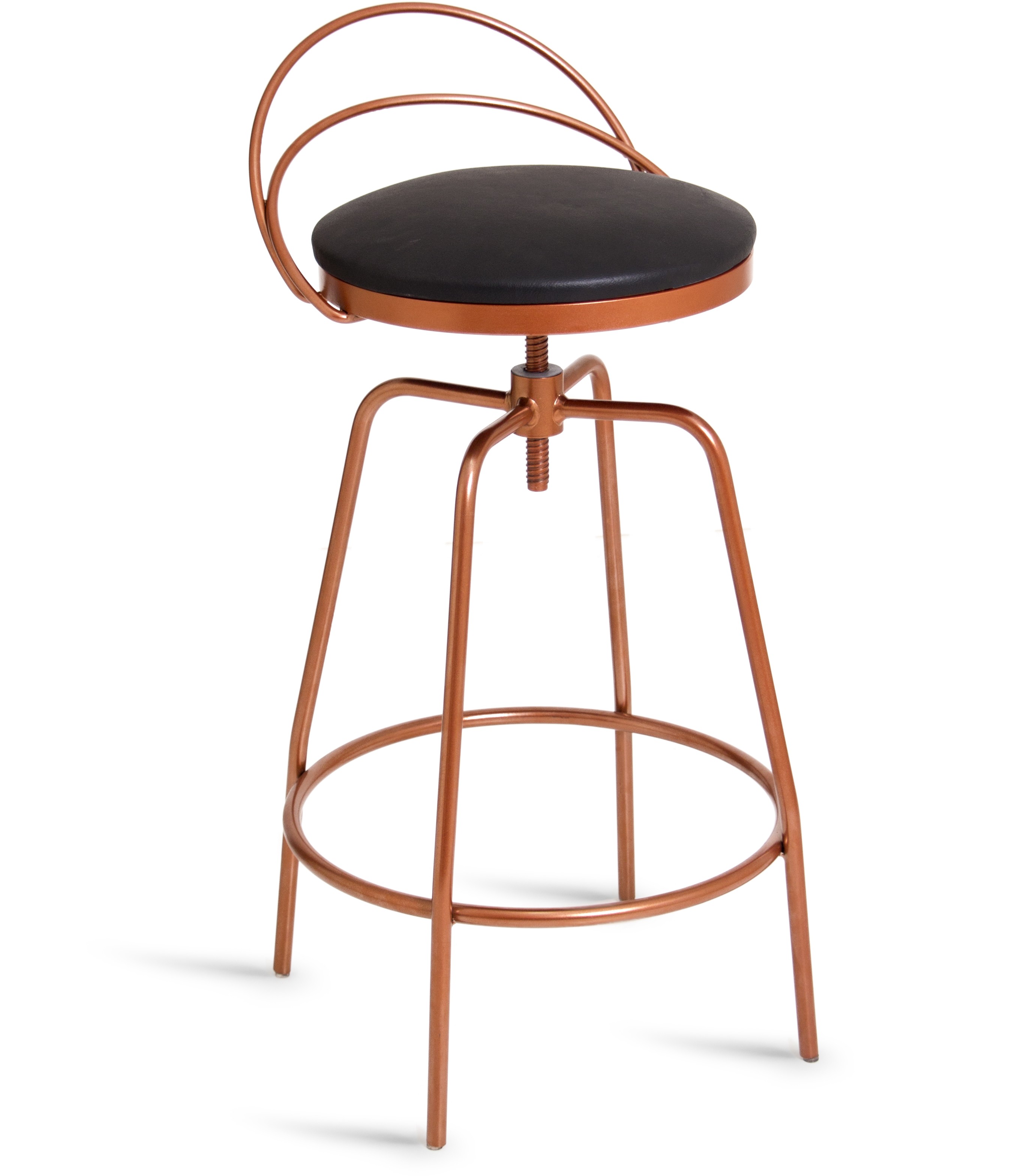 Banqueta com regulagem de altura entre 650 a 750 mm em ferro red. 5/8, giratória, encosto em ferro redondo e assento estofado