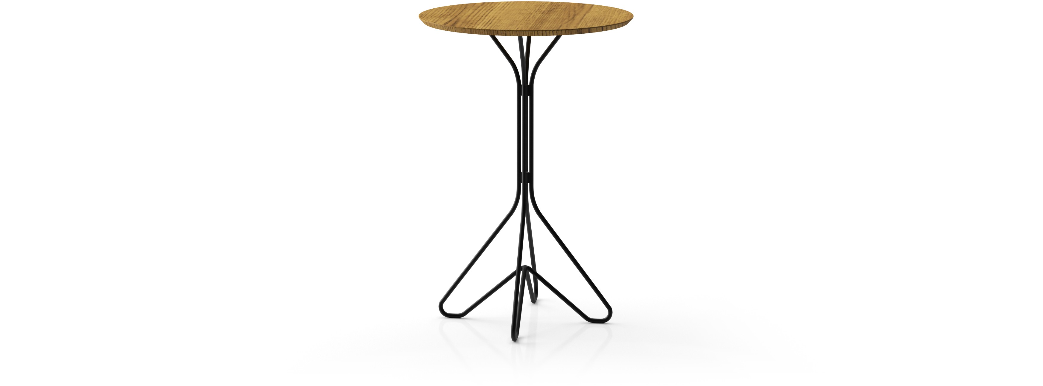Mesa bistro media com tampo diametro 600mm em mdf pintado revestico com laminado natural. Estrutura em terro macico de 1/2. Pintada com tinta epoxi.
