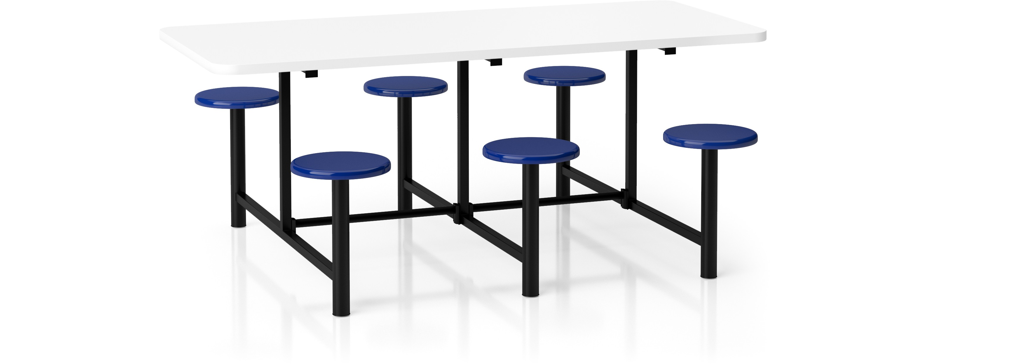 Mesa refeitório MF 3066 com 6 assentos fixos injetados em PVC. Tampo revestido com formica branco brilho, com cantos arredondados e perfil em PVC. Estrutura em tubo de aço carbono 30x30x1,06mm. Somente pintada Medida do Tampo 120x80x0,25cm. Medida da mesa 120x152x76cm